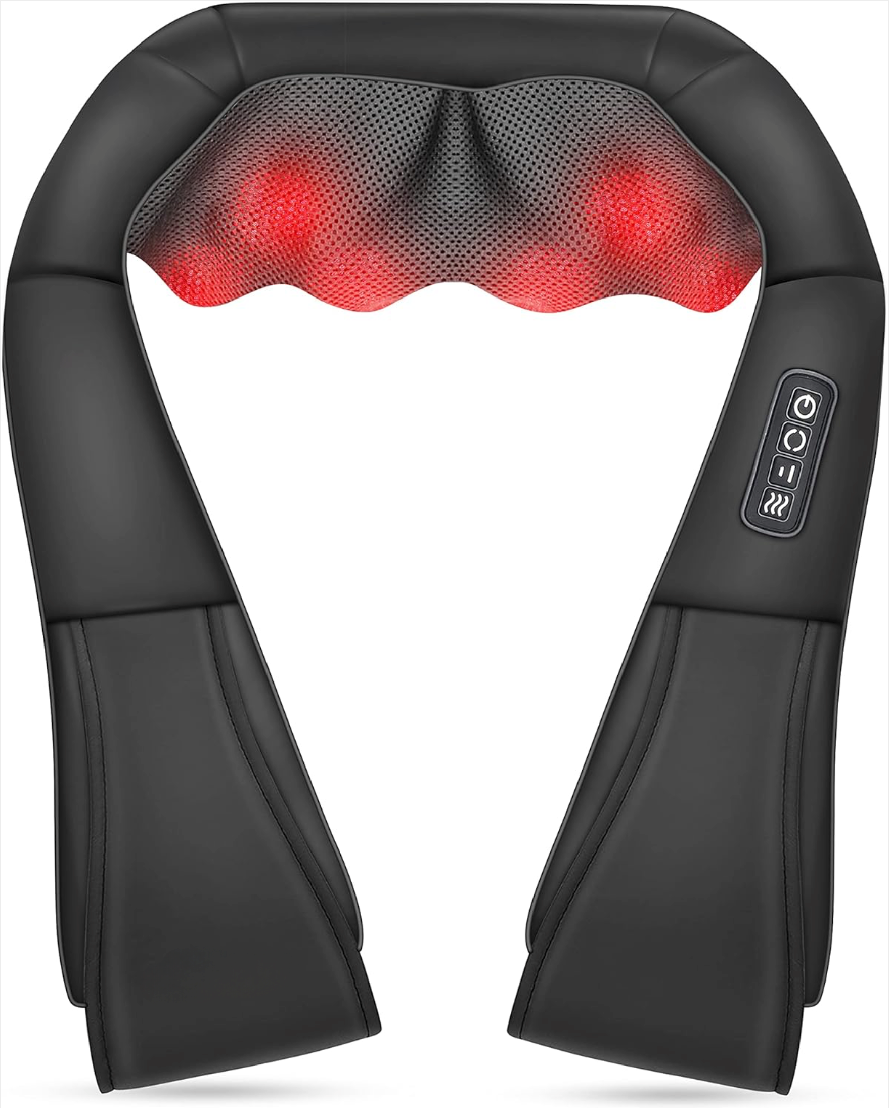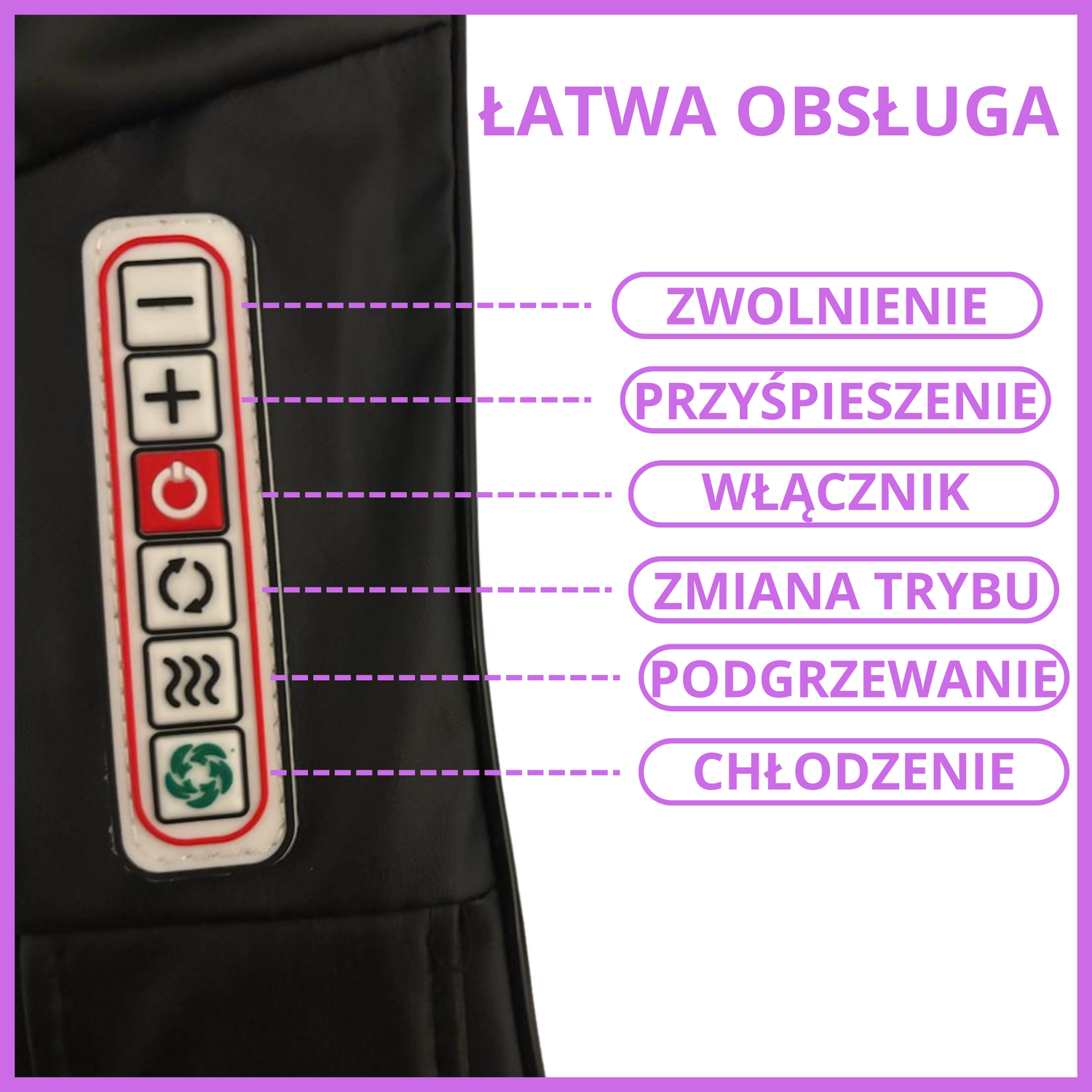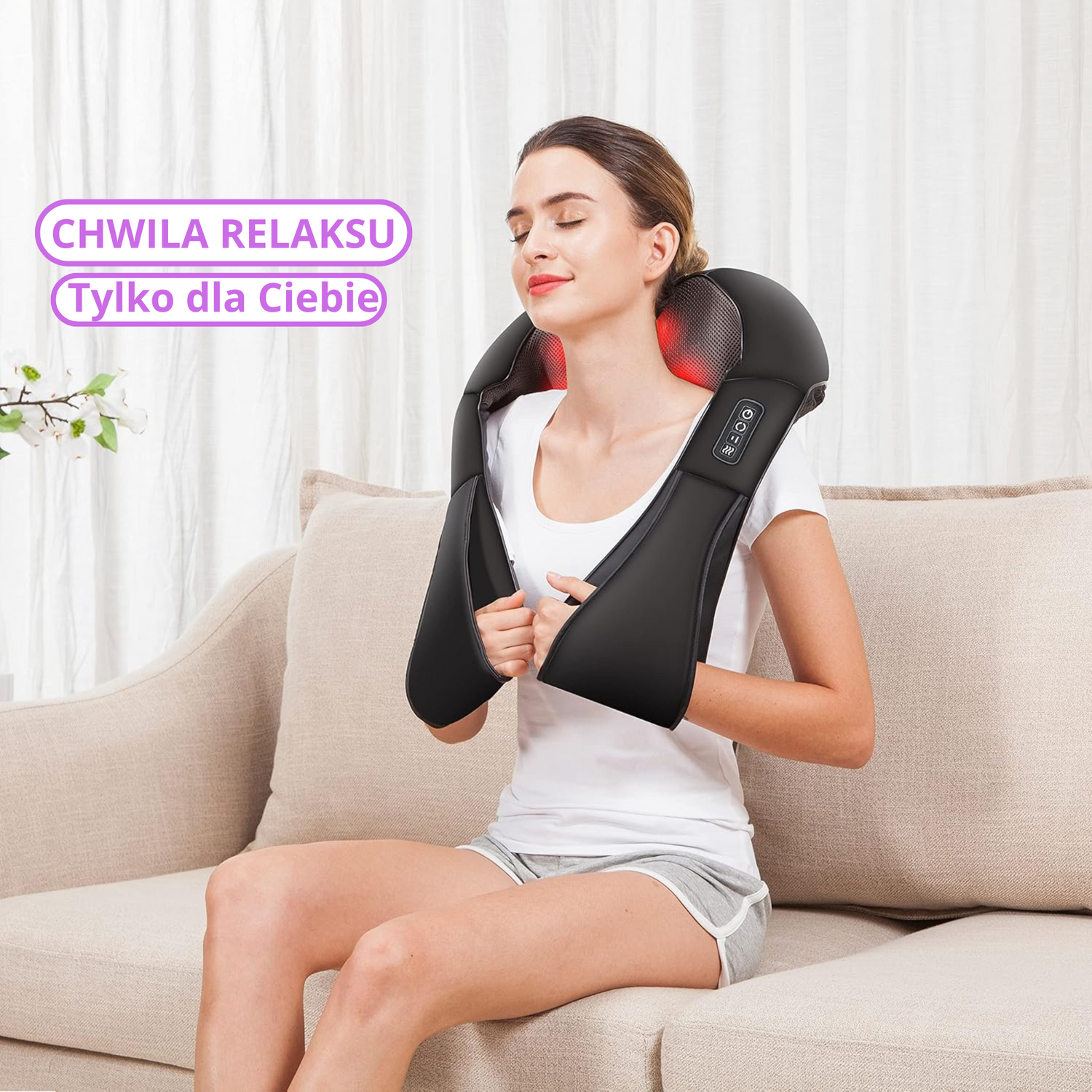 Ten masażer wykonuje głęboki masaż w stylu Shiatsu – rytmiczne ruchy, delikatny ucisk i rozgrzewające ciepło, które rozluźnia spięty kark, szyję i ramiona w kilka minut.